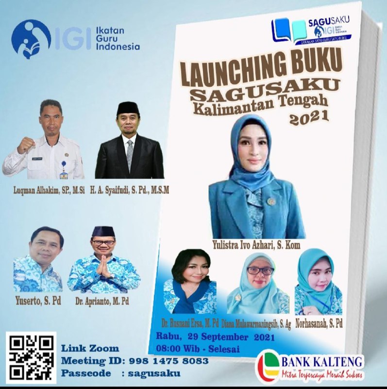 Kalimantan Tengah, IGI.OR.ID- Kegiatan Launching Buku Karya Guru Penulis yang tergabung dalam Kanal Pelatihan Ikatan Guru Indonesia (IGI) Satu Guru Satu Buku (Sagusaku) Kalimantan Tengah, berhasil dilaksanakan pada Hari Rabu tanggal 29 September 2021 di aula Dikominfo Sandik Provinsi Kalimantan Tengah. Kegiatan dilaksanakan secara virtual dan faktual mengingat adanya pembatasan peserta kegiatan oleh Satgat Covid.