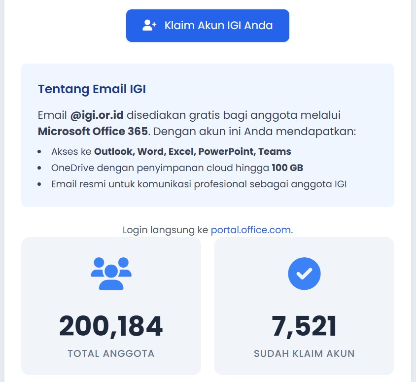 Setiap anggota menerima email resmi nama@igi.or.id yang terintegrasi dengan layanan Office 365.