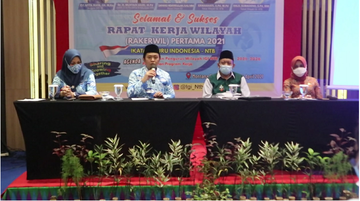 Mataram, IGI.OR.ID- Gelaran Rapat Kerja Wilayah (Rakerwil) yang pertama kali dilaksanakan oleh Ikatan Guru Indonesia (IGI) NTB sukses berjalan dengan baik selama 2 (dua) hari dari tanggal 3 – 4 April 2021 berlokasi di Montana Premier Hotel Senggigi Lombok Barat NTB. Rakerwil tersebut terlaksana atas dukungan Bank Syariah Indonesia Mataram dan CV. Mitra Media Ilmu (MMI) Mataram.